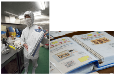 冷凍庫の在庫確認には、在庫表のプリントアウトにペンで現在の数量を記入する。開発室の開発工程では、調味料などの配合を記入した試作計算表を打ち出して、試行錯誤の結果を記入する。製造現場ではパウチで加工した作業指示票をもとに進める。包装紙の資材倉庫では担当者が持ちだした数を備え付けの表に記入するといった具合だ。