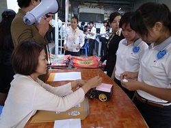 参加学生の登録が始まった。手前は登録の手伝いをしてくれた青年海外協力隊の山口裕代さん(筆者撮影)