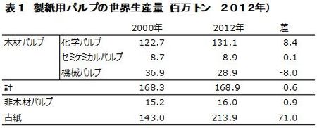 2000年と2012年の世界の生産量を比較すると、木材パルプの合計は2000年に1億6830万トンであったが、2012年にはほぼ同数の1億6890万トンだった。すなわち、10年以上にわたって増加していない。非木材パルプも同様である。