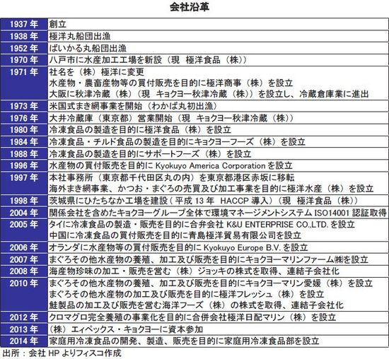 同社は、昭和12年(1937年)に設立された。その後、昭和46年(1971年)に社名を極洋に変更し、事業内容を水産食品の買い付け、製造、販売事業へ拡大していった。平成8年(1996年)には、水産物の買い付けを目的に、米国にKyokuyo America Corporationを設立した。