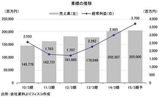 2015年3月期は売上高205,000百万円(前期比1.3%増)、営業利益3,700百万円(同26.9%増)、経常利益3,700百万円(同23.9%増)、当期純利益2,300百万円(同22.5%減)が予想されている。水産物市況にもよるが、現在掲げている施策を実行していけば達成は可能だろう。