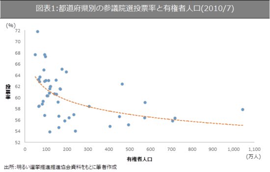 次の国政選挙は衆議院の解散がない限り、2016年7月の参議院選挙になります。以前から気になっていたので、図表1にあるように有権者人口と投票率の関係を、「公益財団法人 明るい選挙推進協会」の資料から2010年7月の参議院選挙を例に都道府県で見てみました。結果は驚くことではありませんが、やはり傾向的に有権者人口が少ない県ほど投票率が高いといえそうです。特に、有権者人口が300万人未満、首都圏をはじめとする大都市圏以外のいわゆる地方では、有権者人口が少なくなるほど近似線の変化が大きくなっています。人口が少ない地域では、どのような人々が投票率を押し上げているのでしょうか? 答えは驚くものではありません。