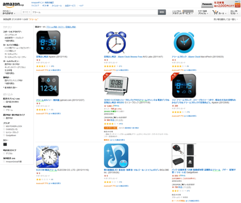 Amazonといえば、個人の購買や閲覧履歴を解析して、興味を持ってもらえそうな商品を表示してくれるが、アプリストアでも同様に利用者の興味をひくアプリが紹介される。また、Amazonのサイトですべてのカテゴリーに対して検索を行うと、対象となる商品だけではなく、アプリもリストアップされる。例えば、『アラーム』というキーワードで検索してみると、一般的なアラーム時計と一緒に、スマートフォンを目覚まし時計のように使えるアプリも探し出される。