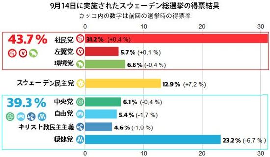さらに特徴的なことは、既成の政党が大幅に支持を失い、いわゆる新興政党が票を伸ばしたことと言える。社民党の勝因を一言で言うと、「政権党である穏健党の支持票が大量に極右党に流れた」からだ。