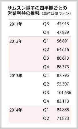 同社の営業利益は2013年7~9月期に10兆ウォン(1円=10ウォン)を超えたのがピークだった。2014年4~6月期には7兆ウォン強に落ち込み、「業績ショック」が証券市場を駆け巡った。