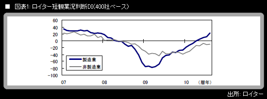 ロイター短観の8月調査(調査期間:7月26日~8月10日、241社が回答)で、業況判断DI(400社ベース)は、製造業が+22(前月比+10ポイント)で、2007年11月以来の高水準。非製造業は▲10(前月比+2ポイント)になった。足元の企業マインドは、円高にもかかわらず、製造業を中心に改善を続けていることが分かる。新興国需要の取り込みもあって、4-6月期の決算が好調だったことが主因だろう。