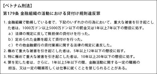 詳細は不明だが、ベトナムでも金融機関に勤務する役職員には厳しい処罰規定があり、時折、こうした金融界の大物の逮捕劇をニュースで見ると、ベトナムの金融不祥事の歴史を思い起こさずにはいられない。