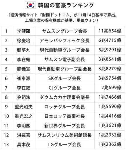 他にも、鄭夢九(チョン・モング)現代自動車グループ会長や、崔泰源(チェ・テウォン)SKグループ会長、具本茂(ク・ボンム)LGグループ会長が上位に入った。韓国の財閥の資産規模が1位、2位、3位、4位で、オーナー会長が富豪ランキングの上位を占めることは当然と言えば当然だろう。