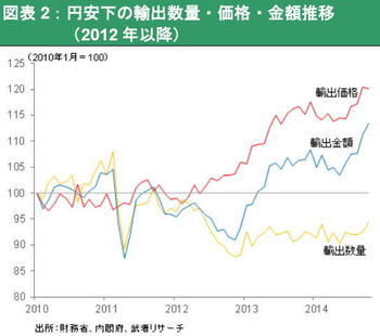 アベノミクスの成果つまり円安のプラス効果が見えていないのは、日本企業の貿易構造が大きく変わっているからである。かつての円安の景気浮揚効果は、円安によって輸出数量が増えて国内の生産が増加し、それが連鎖的な好影響をもたらすという形で、国内経済を押し上げた。図表1は前回の円安局面(2000年以降)での輸出数量と輸出単価の推移であるが、円安が始まっても輸出価格はあまり上昇せず(つまりドル建て値下げがなされ)、輸出数量が大きく増加していることが分かる。しかし今回の円安局面では図表2に見るように、輸出価格が大幅に上昇している一方で輸出数量が低迷を続けている。円安局面での輸出企業の対応が10年間で180度変わっているのである。