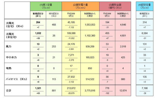 固定買取価格制度における再生可能エネルギー発電設備の導入状況 平成26年9月末時点(平成26年12月24日更新)「固定価格買取制度 情報公表用ウェブサイト」より
