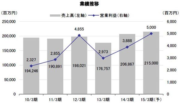 2015年3月通期業績は期初予想から上方修正され、売上高215,000百万円(前期比3.9%増)、営業利益5,000百万円(同28.6%増)、経常利益5,000百万円(同27.6%増)、当期純利益3,500百万円(同41.9%増)が予想されているが、最大の商機である年末商戦の動向次第では、更なる上方修正の可能性もありそうだ。