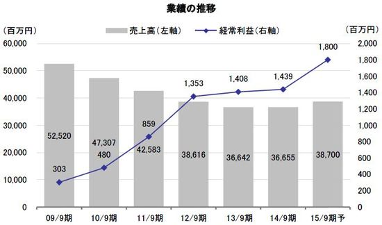 2015年9月期通期の連結業績は、斡旋事業の拡大をけん引役として、売上高が前期比5.6%増の38,700百万円、営業利益が同13.8%増の2,400百万円と増収増益に転じると同社は見込んでいる。また、配当金については2014年9月期並みの年間10円を予定している。当面は安定的な配当実施を基本に考えているが、中期的には特別利益などを除外した実質ベースの利益水準で配当性向20~30%がひとつの目安になるとしている。弊社では、今後も収益の拡大が続けば増配の可能性も出てくるとみている。