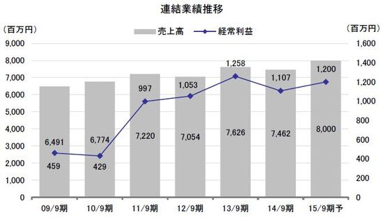2015年9月期の連結業績は、売上高が前期比7.2%増の8,000百万円、経常利益が同8.4%増の1,200百万円と増収増益に転じる見通しだ。再保険事業の成長が続くことに加えて、保険代理店事業でも継続手数料収入(過年度契約分)の拡大が見込まれている。さらには、ここにきて直営店舗での契約件数が伸び始めていることもプラス要因となる。7月以降に新たな営業プロセスマネジメントを導入した効果が出始めているのが要因だ。直営店舗の収益は前期比横ばい水準を前提としているため、今後も増加傾向が続けば業績の上振れ要因となる可能性がある。