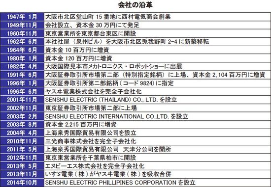 同社は電線の総合商社である。その歴史は古く、1947年に「西村電気商会」として設立された後、下表に見られるように全国へ業容を拡大してきた。2014年10月末時点では従業員数497名、国内連結子会社4社、海外連結子会社4社(タイ、中国、フィリピン)、国内事業所16ヶ所を擁する業界トップクラスの独立系電線商社である。