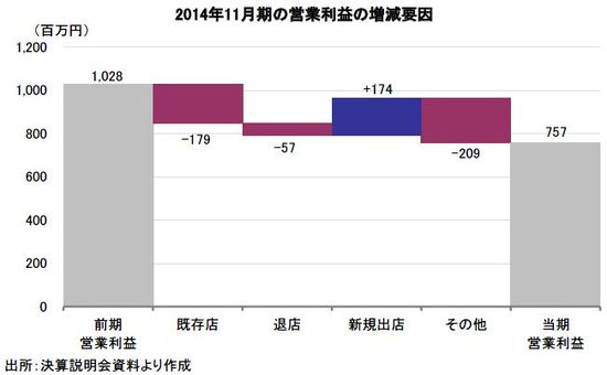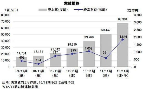 2014年11月期の連結業績は、売上高が前期比26.9%増の50,477百万円、営業利益が同26.3%減の757百万円、経常利益が同44.2%減の591百万円、当期純利益が同44.2%減の326百万円となった。4期ぶりの減益であり、利益面で期初計画比を大きく下回った。期中に10店舗の新規出店をする一方、3店舗の退店を行った。新規出店よる大幅な増収効果は、天候不順や消費増税の影響で打ち消された。
