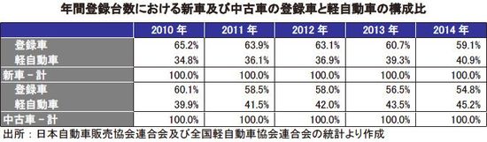 軽自動車の躍進は目覚ましく、2014年の構成比は新車で40.9%、中古車で45.3%に高まった。特に、一家で複数台の自動車を所有するローカルエリアでの需要が高い。