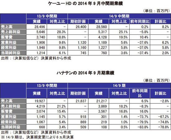 ケーユーHDとハナテンも厳しい経営環境に置かれている。下表のように2014年9月期において前年同期比約4割から8割程度の減益となった。