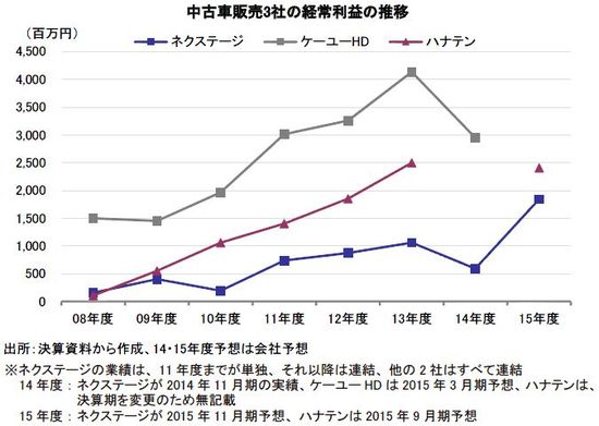 積極的な出店が奏功して、同社の売上高は急速に伸びている。中古車販売会社3社の売上高推移から、同社が急速に先行企業に追いつき、追い越す様子が見られる。ハナテンは、2014年9月期に、決算期を3月から変更したため、6ヶ月の変則決算となったことから、売上高と経常利益の推移図では、2014度の数値をブランクにしてある。