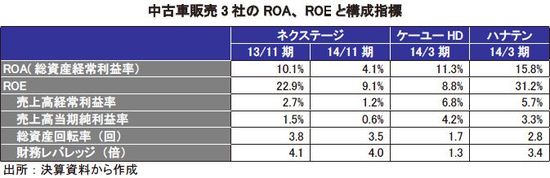 同社は、中古車販売3社の中で、財務安全性の指標が見劣りする。現在は、成長を優先させている結果だ。一方、ケーユーHDは、国産中古車の販売よりも輸入車の正規ディーラーとしての新車販売が大きく、財務安全性が高い。流動比率は200%を超え、自己資本比率も70%超と安全性で理想とする水準に達している。一方、それが資産効率を低くし、ROEがROAを下回る一因となっている。