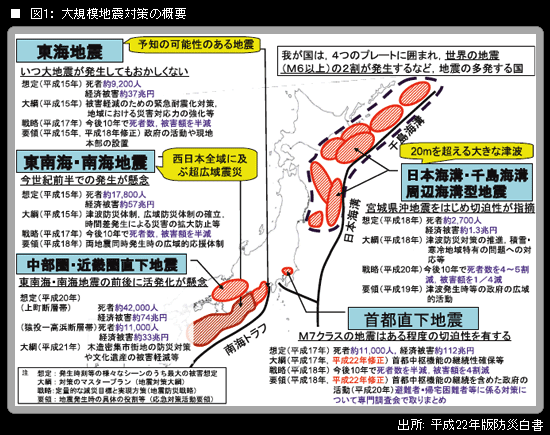 平成22(2010)年防災白書によれば、近い将来発生が危惧される大規模災害の被害想定は甚大なものと予想されている。
