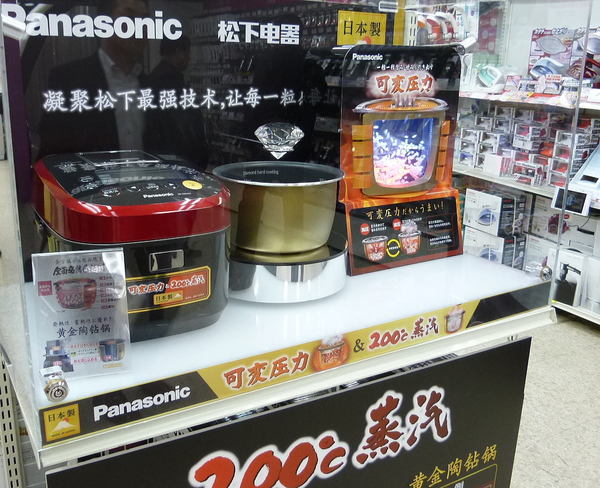 中国語の製品説明を添えて展示されている日本製炊飯器(東京・秋葉原の家電量販店にて)