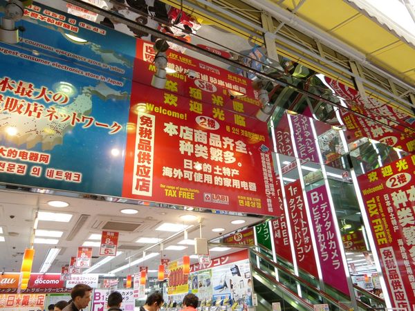 中国語の看板で中国人観光客を大々的に出迎える東京・秋葉原の家電量販店