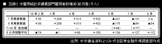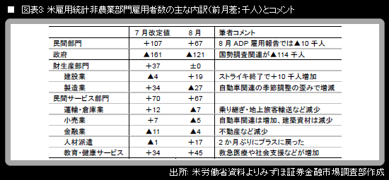 当面の市場動向のカギを握るイベントとして市場が注目していた米8月の雇用統計が、9月3日に発表された。民間部門の雇用者数は+6万7000人(前月差、以下同じ)となり、市場予想の中心であった+4万1000人よりも強い数字になった。6月分は+3万1000人から+6万1000人へ、7月分は+7万1000人から+10万7000人へ、それぞれ大幅に上方修正された(上方修正幅の合計は+6万6000人)。米国経済が「日本型デフレ」に陥るのではないかといった、筆者からみると「行き過ぎた悲観論」に属している市場の思惑は、さらに後退。米長期金利は上昇した。