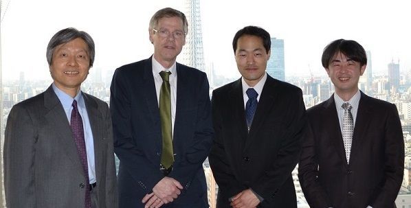 2015年マルクス・ヴァーレンベリ賞の受賞者たち。左から東京大学大学院農学生命科学研究科 磯貝明教授、マルクス・ヴァーレンベリ財団事務局長 カイ・ローゼン教授、西山義春博士(フランス国立科学研究所植物高分子研究所上級研究員)、東京大学大学院農学生命科学研究科 齋藤継之准教授(写真提供:カーボンニュートラル資源研究所・藤原秀樹)