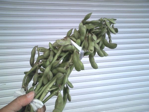 野趣に富む枝付きの枝豆。このまま鍋に入れて煮て、サヤを外しながら食べる