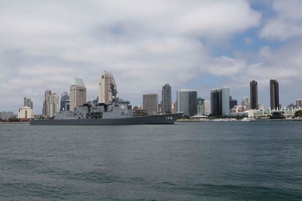 多国籍合同訓練「ドーンブリッツ2015」においてサンディエゴ港に入港するイージス駆逐艦「あしがら」。合同訓練への参加には、もちろん多大な費用がかかる