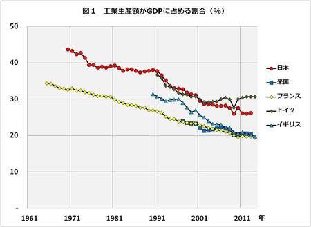 だが、図1を見て欲しい。これはGDPに占める工業生産額の割合を示したものである。図には日本を含む先進5カ国を示した。大阪万博に沸いた翌年の1971年、日本の工業部門はGDPの44%を生み出していた。だが、それは2013年には26%にまで低下した。