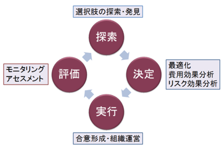下の図は組織における意思決定のプロセスを概念化したものである。何らかの課題を解決する上では、選択肢(対策案や事業案)を設定する必要がある。複数の有力な選択肢がある場合には、それぞれのコストやリスクとベネフィットを比較し、最適な選択肢を選ぶ。この段階で責任者が決裁を行い、対策や事業が実行される。その実行過程で生じた問題をチェックし、想定外の問題が生じた場合には選択肢を修正する。