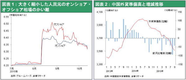 図表1に見るごとく、8月11日の人民元切り下げ以降急拡大していた人民元香港相場(オフショアレート)と中国国内相場(オンショアレート)の格差が急収縮している。中国政府による人民元相場死守の意図が、如実に市場に現われたものとみられる。