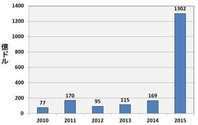 そしてこの大型M&Aの波が、半導体製造装置業界にも到来したわけだ。2010年以降の半導体業界におけるM&Aの規模の推移を見てみると、2015年は10月22日時点で既に1302億ドルに達した(図1)。