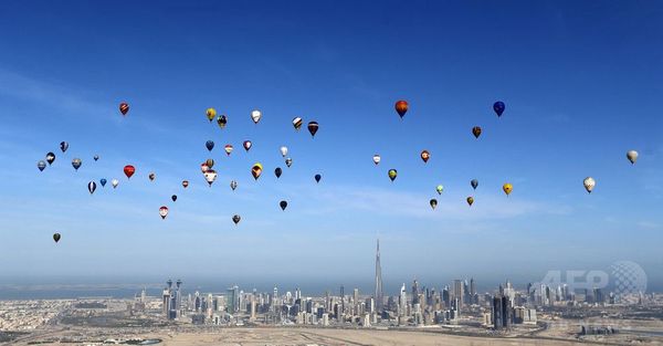 Hot air balloons fly over Dubai during the World Air Games 2015, held under the rules of the Federation Aeronautique International (FAI) as part of the "Dubai International Balloon Fiesta" event on December 9, 2015. (c)AFP/KARIM SAHIB