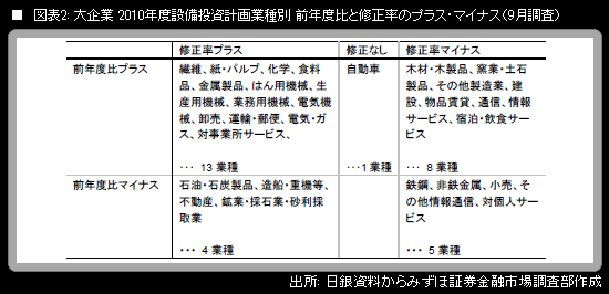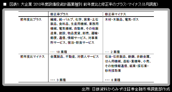 まず、大企業の2010年度設備投資計画(土地投資額を含み、ソフトウェア投資額は含まない。リース会計対応ベース)について、業種別の前年度比プラス・マイナスを表にすると、以下のようになる。