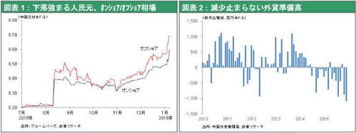 中国株安に呼応して世界株式も新年に入り急落開始、世界金融不安が急速に高まっている。世界株安の要因としては北朝鮮の核実験、サウジとイランの国交断絶、ロシアトルコ間の緊張など地政学不安の高まりも指摘されているが、世界株安の主因は圧倒的に中国であろう。株式ととともに年初早々人民元安も進行している。