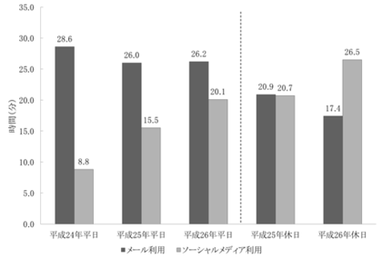 図1 平日・休日のコミュニケーション系メディア利用時間の推移(出所:総務省「平成26年情報通信メディアの利用時間と情報行動に関する調査報告書」)
