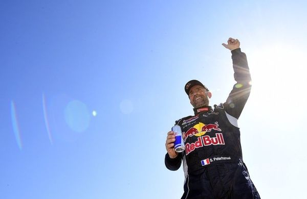 Peugeot's French driver Stephane Peterhansel celebrates his victory after the Stage 13 of the Rally Dakar 2016 between Villa Carlos Paz and Rosario, Argentina, on January 16, 2016. (c)AFP/FRANCK FIFE
