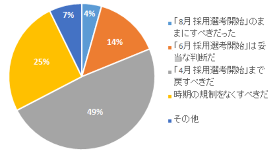 全体集計の結果では、「『8月 採用選考開始』のままにすべきだった」とする企業は4%しかなく、最も多かったのは「『4月 採用選考開始』まで戻すべきだ」で、49%と半数にも及ぶ。「時期の規制をなくすべきだ」とする意見も25%と4分の1もあり、今回の「『6月 採用選考開始』は妥当な判断だ」と評価する企業は14%と少数派にとどまっている。