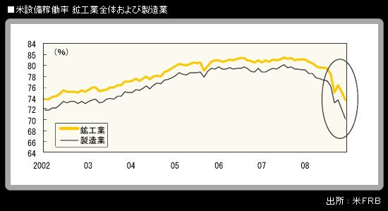 米12月の鉱工業生産で、鉱工業全体の設備稼働率は73.6%(前月比▲1.6ポイント)。FRB(米連邦準備理事会)データで下4ケタの数字を見ると73.5762%で、ITバブル崩壊後の直近ボトムである2001年12月(73.5959%)をわずかに下回っており、1983年4月(73.1625%)以来の低水準ということになる。また、製造業のみの稼働率(通常報じられているSICベースの産業区分の数字)は70.2%(前月比▲1.7ポイント)で、こちらは1983年2月(70.0%、下4ケタでは69.9512%)以来の低水準である。