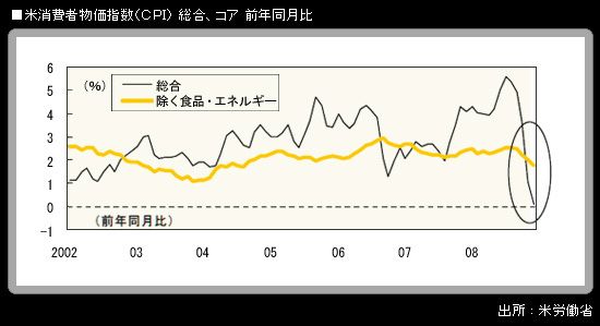 米12月の消費者物価指数で、コアは前月比0.0%にとどまった。10月が前月比▲0.1%で、11月が同0.0%。これで3カ月連続して、コアは上昇せず、横ばい以下にとどまっていることになる。しかも、消費者物価は基本的には遅行指標なので、2008年秋からの急激な景気悪化が、これから押し下げ圧力として影響してくることになる。