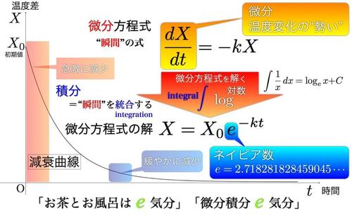 お茶の温度は入れ立て時に急減に下がり、時間が経った後ではゆっくり温度が下がることを私たちは経験で知っていますが、そのことを表したのが微分方程式です。微分とは刻一刻変化する様子を表す言葉です。