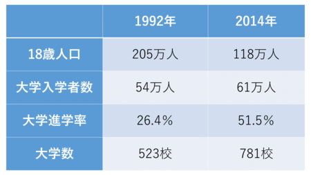 以下の表をご覧いただきたい。18歳人口がピークを迎えた1992年と直近の2014年の数値を単純に比較してみる。