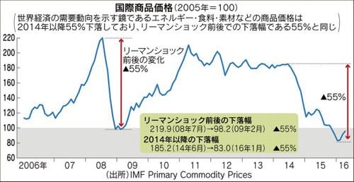 伊勢志摩サミットでの安倍首相の発言は、世界に大きな反響を呼んだ。彼は「エネルギー・食料・素材など商品価格がリーマン・ショック前後での下落幅である55%と同じ」で「リーマン級の経済危機再燃を警戒する」と説明し、消費税率の10%への増税を再延期する考えをにじませた。