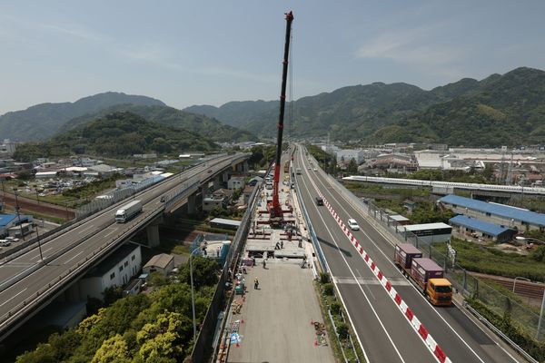 工事は、東名高速・静岡IC~焼津IC区間にある用宗高架橋(もちむねこうかきょう)からスタートした。老朽化している鉄筋コンクリート床版を道路から引きはがし、新しい床版に取り換える大掛かりな工事だ(写真1)。