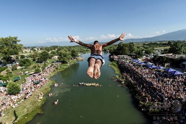 People look at a man as he jumps from the 22 meters high bridge Ura during the High Diving competition near the town of Gjakova on July 31, 2016. (c)AFP/ARMEND NIMANI