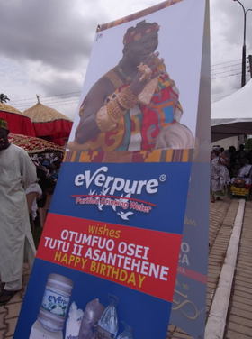 人々は、赤や金の布を張った大きな傘を持っていた。その傘の大きさといえば仮設テントほどもあった。広場の片隅に傘を休ませつつ、自らもその傘の下に腰掛けて休む男たちの姿が見える。ざわざわと賑やかな広場が何か大事な祭りの会場であるということが、彼らのうやうやしく傘を扱う姿から分かった。その中には私たちのほかにアジア人などおらず、私たちはそれなりに注目を集める。好奇心を持った祭り風情の女が近づき、男は携帯で写真を撮ろうとする。そこでやっと、これは何のお祭りかと聞く。ひとりの男が広場の片隅に、立て看板を指さす。そこには「ハッピーバースデー」とあった。「アシャンティのオセイ・トゥトゥ2世陛下、誕生日おめでとう」と。