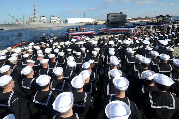 米軍関係者はトランプ氏の軍事力強化策に大きな期待を寄せている。バージニア州のノーフォーク海軍基地で整列する潜水艦乗組員(出所:米海軍、photo by Chief Petty Officer Darryl I. Wood/Released)
