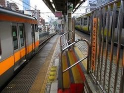 御茶ノ水駅の神田側ホーム:左の中央線側と右の総武線とで1メートル近くの段差がある